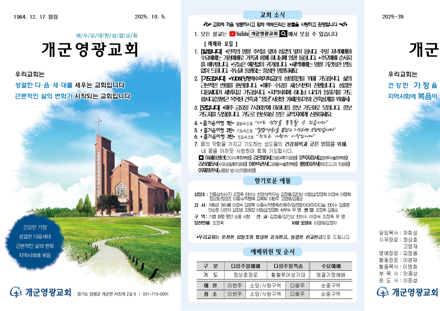 | 이전글 | 2025년 10월 12일 주보입니다 | 운영자 | 2025.10.11 | 0 | 47 |